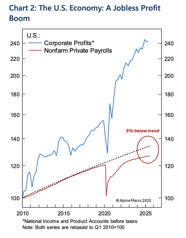 Booming corporate earnings and a slumping labor market have been telling very different stories lately, and AI is the likely explanation, according to Chen Zhao, chief global strategist at Alpine Macro.