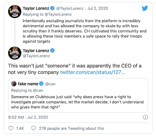 Lorenz then claims that she "woke up today to [people] trying to reset my passwords and hack into my accounts" while also receiving "vicious, disgusting threats." She also said that some big names in the VC world were insulting her on Clubhouse, including Srinivasan. Input has contacted both Lorenz and Srinivasan for comment and will update accordingly.