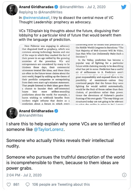 The tussle speaks to the larger fight for power between VCs and journalists. Time's editor-at-large Anand Giridharadas tweeted, "VCs TEDsplain big thoughts about the future, disguising their lobbying for a particular kind of future that would benefit them with the language of prediction."