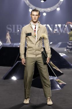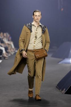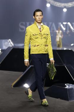 The African influence extends to colour stripes accentuating shirts from the S'Homme collection, which also includes a beige hoodie trench coat with badges on the sleeves, a sage-green two-button suit, and a yellow safari jacket matched with navy-blue cropped pants.