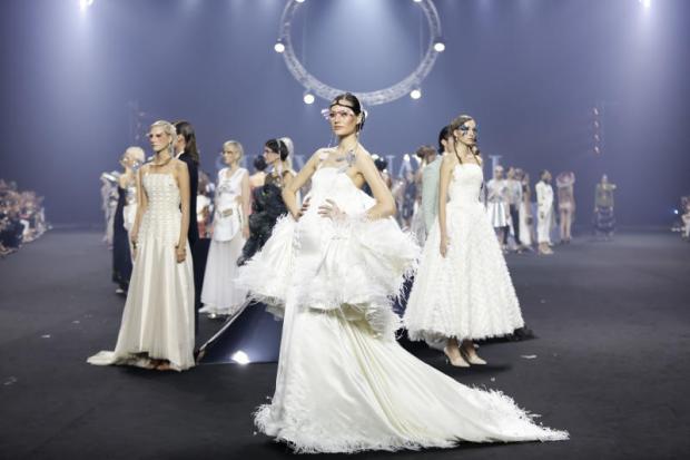 Comprising 67 looks, the runway show began with models strutting space-age outfits such as a bolero Lurex tweed jacket paired with a dress in the same fabric and a cocktail peplum dress with metallic quilt details.