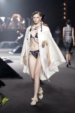 Other key pieces included a zebra-sequinned tulle blouse with hand-stitched feather details, and a white corset dress with double layering of burgundy silk and African bead fringes.