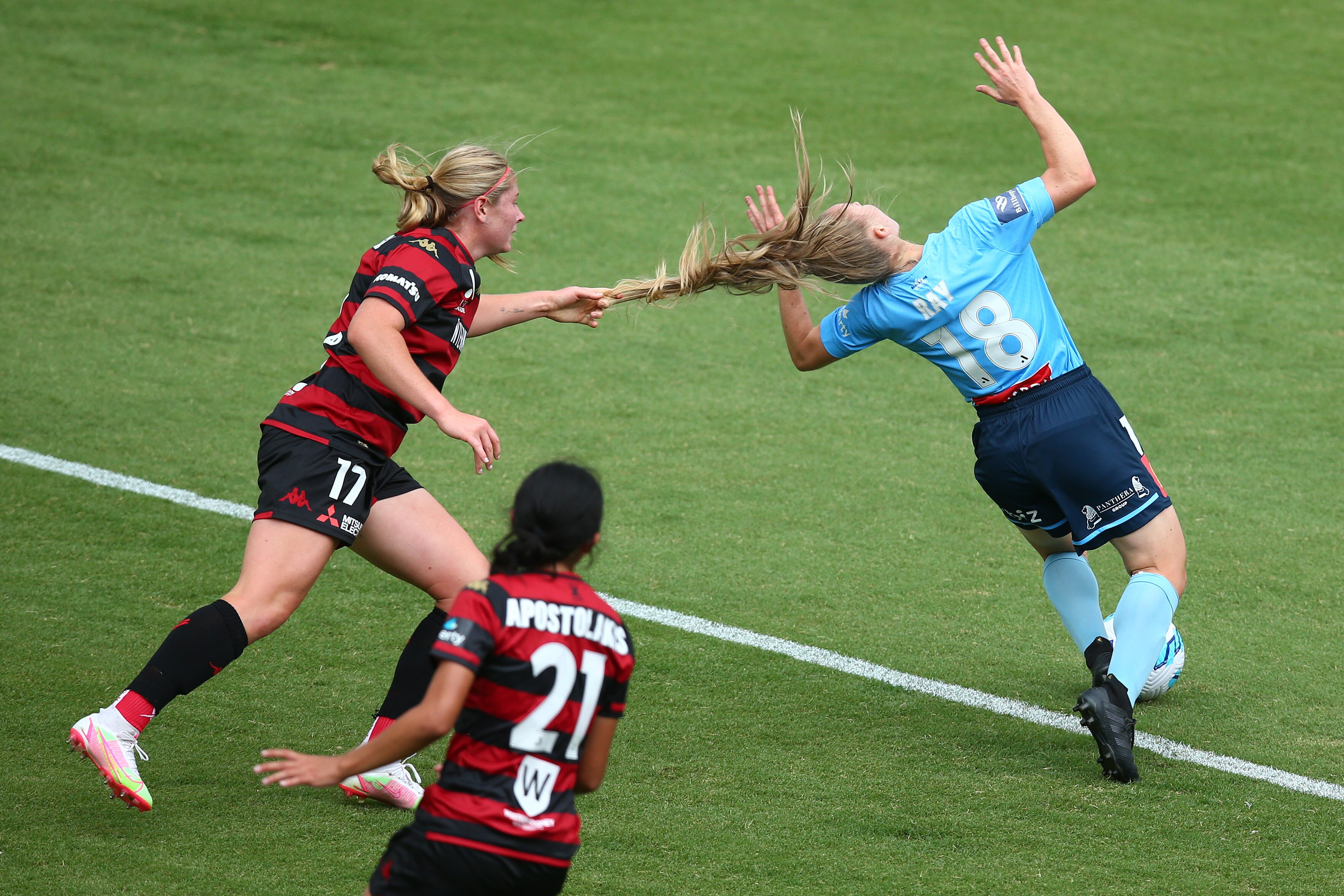 It will be one of the defining images of the 2021/22 ALW season: Wanderers forward Sheridan Gallagher's fist wrapped around the long, blonde ponytail of Sydney FC midfielder Taylor Ray as she tries to spin away with the ball. Ray, as shocked by the moment as those watching from afar, throws her arms out wide like she's being electrocuted as Gallagher pulls her to the ground.