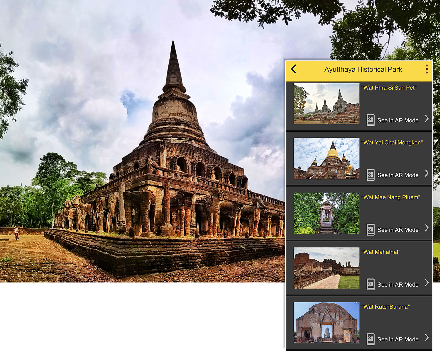 In Thailand, the Department of Fine Arts launched the AR Smart Heritage application, which provides virtual experiences at more than 30 popular tourist attractions such as the famed ancient temple sites in Sukhothai, Si Satchanalai, Kamphaeng Phet and Ayutthaya.
