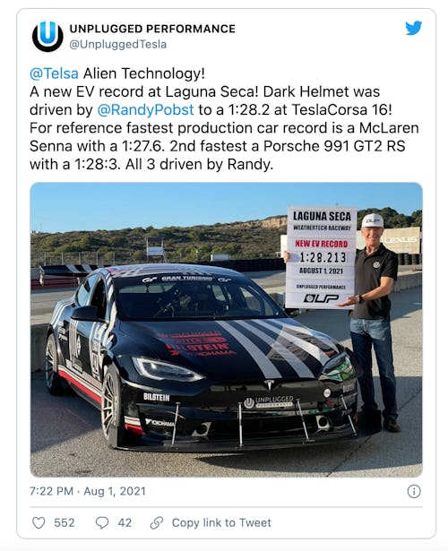 Not only that, but the Plaid’s lap time of 1:28.213 put it just behind the McLaren Senna supercar... which is a pretty great advertisement not just for Tesla, but for EVs more broadly.