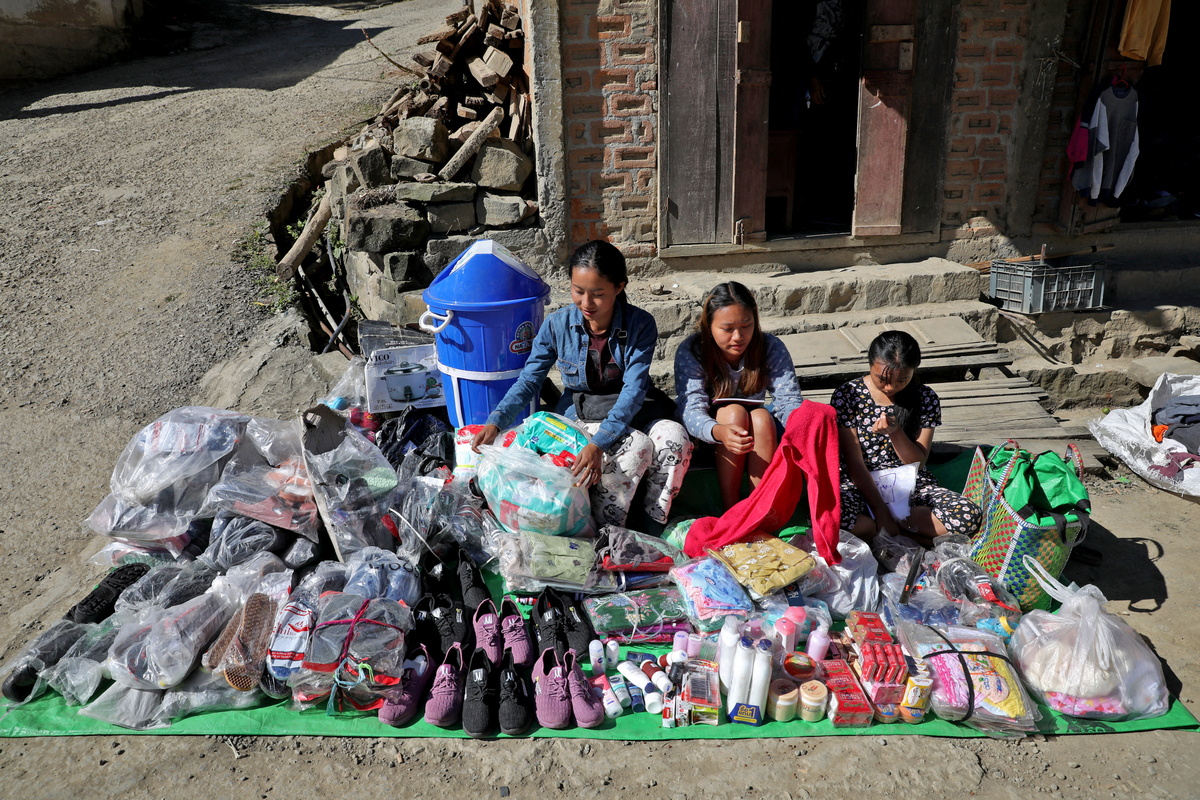 Several days a week, she and her three daughters sit at Farkawn's main crossroads selling plastic slippers, cosmetics and diapers - goods ordered for her shop at home that she managed to bring into India.
