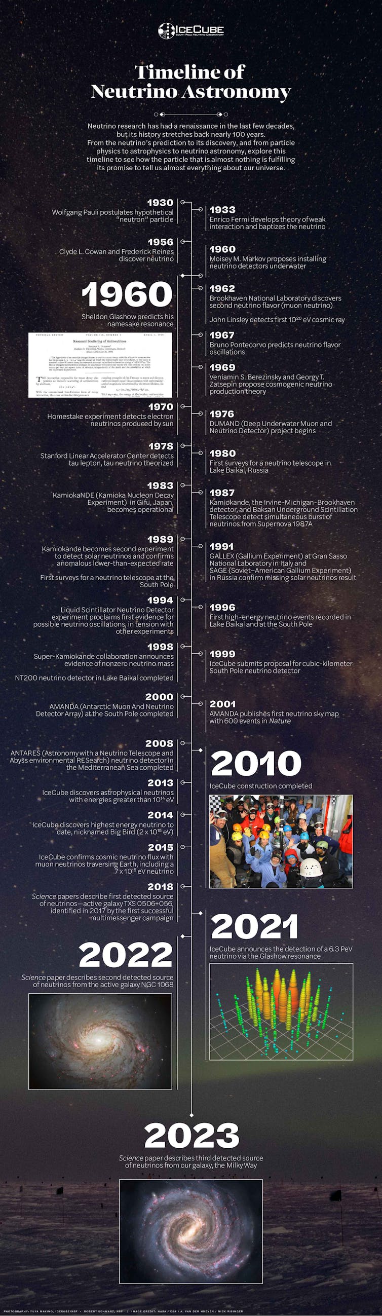 The IceCube Neutrino Observatory is not far from the South Pole. It uses more than 5,000 light sensors arrayed throughout a cubic kilometre of pristine Antarctic ice to search for signs of high-energy neutrinos from our galaxy and beyond.