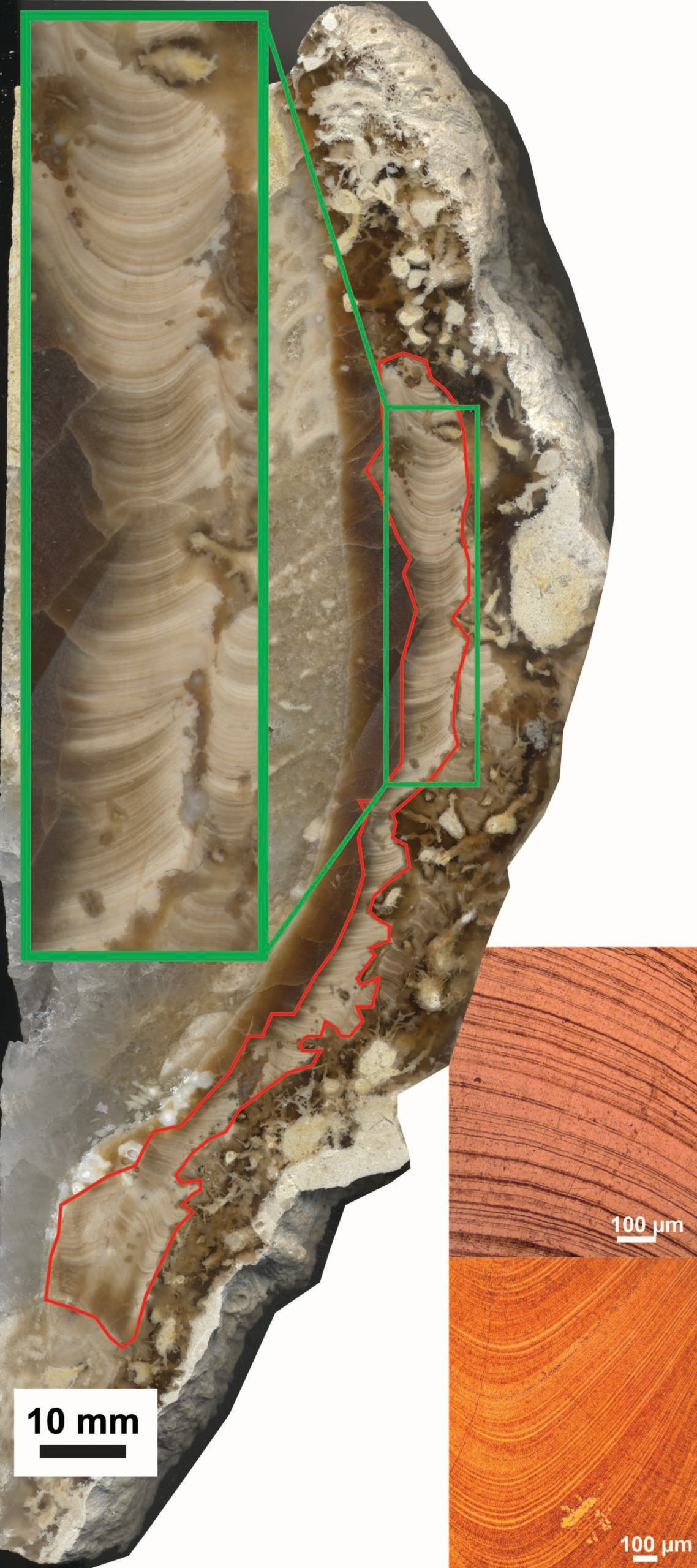 Abstract: This study presents subdaily resolved chemical records through fossil mollusk shell calcite. Trace element profiles resolve periodic variability across ~40‐μm‐thin daily growth laminae in a Campanian Torreites sanchezi rudist bivalve. These high‐resolution records are combined with seasonally resolved stable isotope and trace element records that allow shell‐chemical variability to be discussed on both seasonal and daily scale. A combination of layer counting, spectral analysis of chemical cyclicity and chemical layer counting shows that the rudist precipitated 372 daily laminae per year, demonstrating that length of day has increased since the Late Cretaceous, as predicted by astronomical models. This new approach to determine the length of a solar day in geologic history through multiproxy chemical records at subdaily resolution yields considerably more control on the uncertainty of this estimate. Daily chemical variability exceeds seasonal variability in our records, and cannot be explained by diurnal temperature changes. Instead, we postulate that rudist shell chemistry is driven on a daily scale by changes in light intensity. These results together with those of stable isotope analyses provide strong evidence that Torreites rudists had photosymbionts. Bivalve shell calcite generally preserves well. Therefore, this study paves the way for daily‐scale reconstructions of paleoenvironment and sunlight intensity on geologic time scales from bivalve shells, potentially allowing researchers to bridge the gap between climate and weather reconstructions. Such reconstructions improve shell chronologies, document environmental change in warm ecosystems, and widen our understanding of the magnitude of short‐term changes during greenhouse climates.