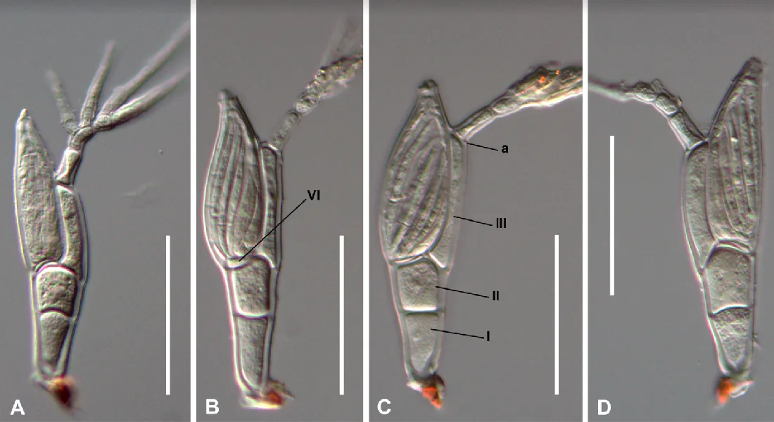 T. twitteri, as it turns out, is a type of parasite that belongs to the Laboulbeniales order of fungi. These species of fungal parasites tend to attach themselves on the outside of hosts, creating one of those horrific images of insects with weird growths all over them. As fungi, one might immediately think of a plant-like organism — but they actually look like small larvae once you put them under the microscope. The 'head' buries into the shell with suction to drain nutrients from its host while the other half sticks up to ready itself for spore spreading.