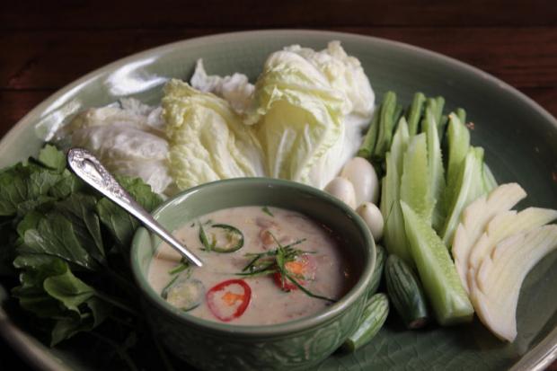 Lhon pla khem (290 baht), a simmered dish of mashed morsels of salt-cured mackerel, shallots and other herbs in coconut cream, was one of the delightful dishes I had. The creamily salty delicacy is best enjoyed with rice as well as with fresh vegetables, which are served on the side.