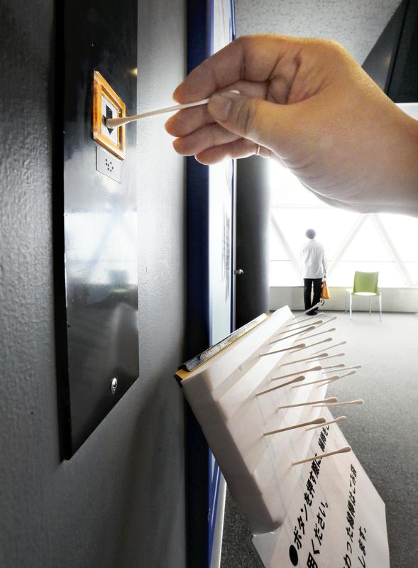 Visitors may use a swab to press the elevator's buttons and then toss it straight into the trash. The practice aims to reduce the risk of spreading the virus. Previously, employees of the tower were said to be disinfecting the buttons constantly.