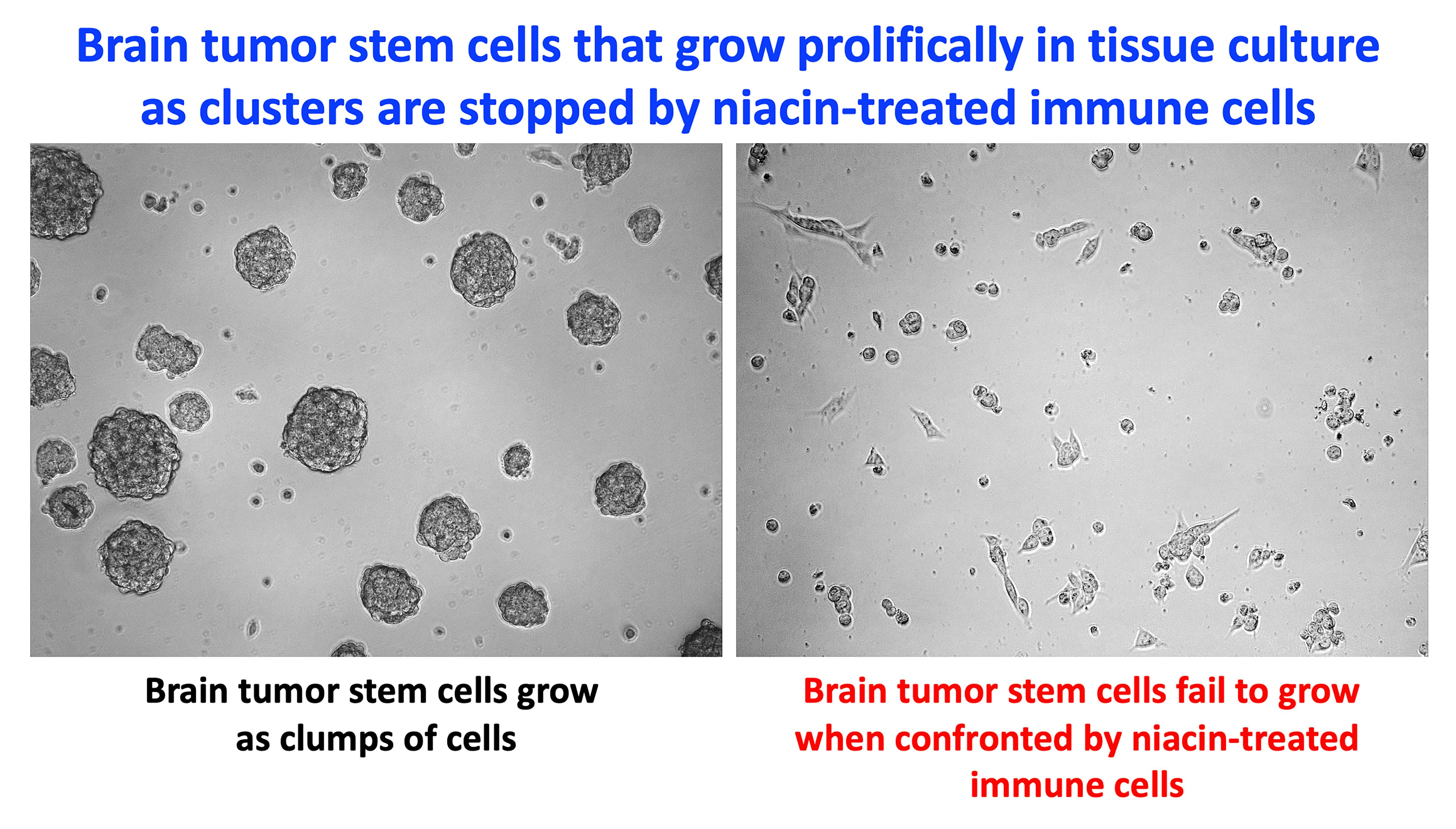 In a cell culture experiment, the research team found that, when treated with niacin, monocytes that had been taken from glioblastoma patients were spurred back into action – they were once again able to quash the growth of the BTICs. With the help of niacin, these immune cells regained the ability to fight off the cancer-generating potential of the brain tumor stem cells.