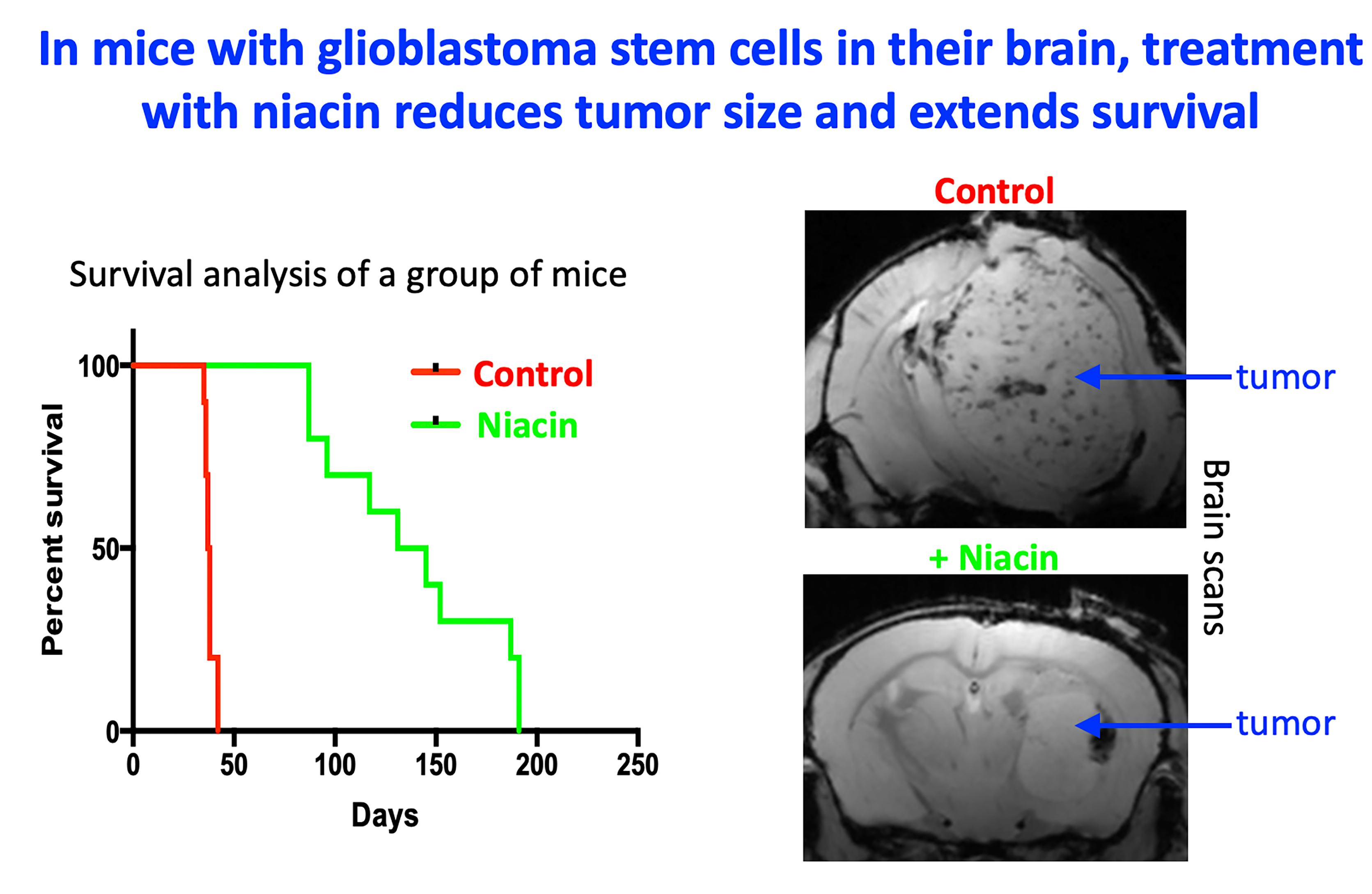 Using mouse models that had been implanted with BTICs derived from human patients to form glioblastomas, they tested how effective niacin worked in vivo. When they treated the mice with the vitamin compound, they found that the growth of the brain tumor was brought under control, and the lifespan of the mice greatly extended. When temozolomide — chemotherapy used to treat brain tumors — was used in combination with the niacin, these effects were enhanced even more.