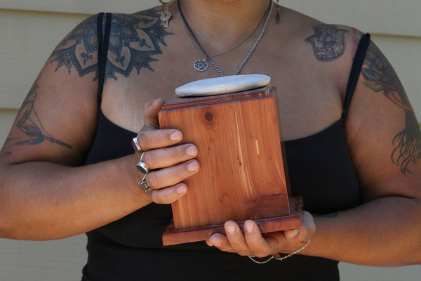 Once Roth or Bressler removes a skeleton from the tank, the bones are patted dry and arranged on a metal tray in a closet-sized space in what was once a garage, behind the Resting Waters office. The dry bones are put into a cremulator, a machine that pulverizes the bones into powder. The powder goes into one of Resting Waters' cardboard canisters, which are compostable and recyclable, and double as scatter vessels. Bressler and Roth would like to offer more choices, and in keeping with their eco-friendly ethos, they help clients find sustainable wood vessels. Once the canister has been filled, clients book a day and time to collect the remains.