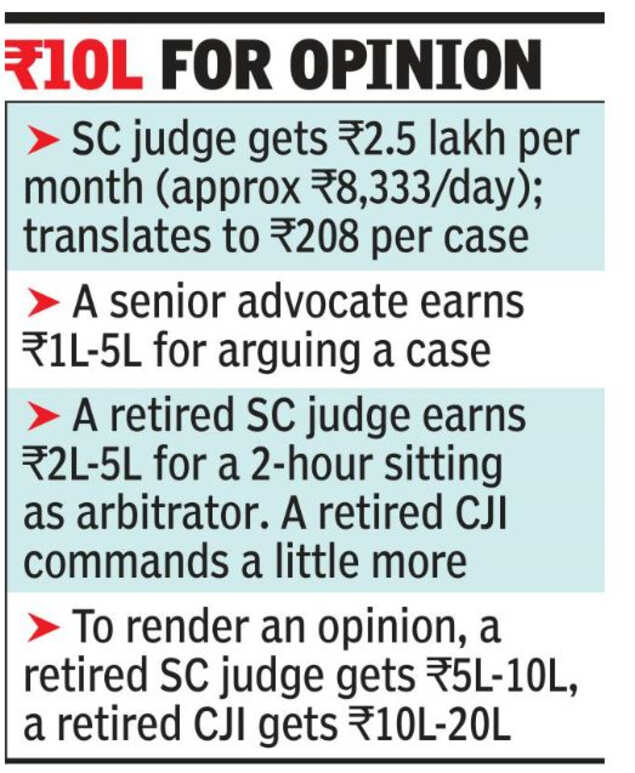 In rendering an opinion, a retired SC judge gets between Rs 5 lakh and Rs 10 lakh while each opinion of a retired CJI fetches her/him Rs 10-20 lakh. A retired CJI confided to TOI: "I do three to four opinions a month and earn between Rs 30-50 lakh, unthinkable money for a sitting judge. I indulge in a lot of charity. And yet, I am left with an amount which is more than the provident fund money I got on retirement after rendering services for more than two decades as a judge of constitutional courts."