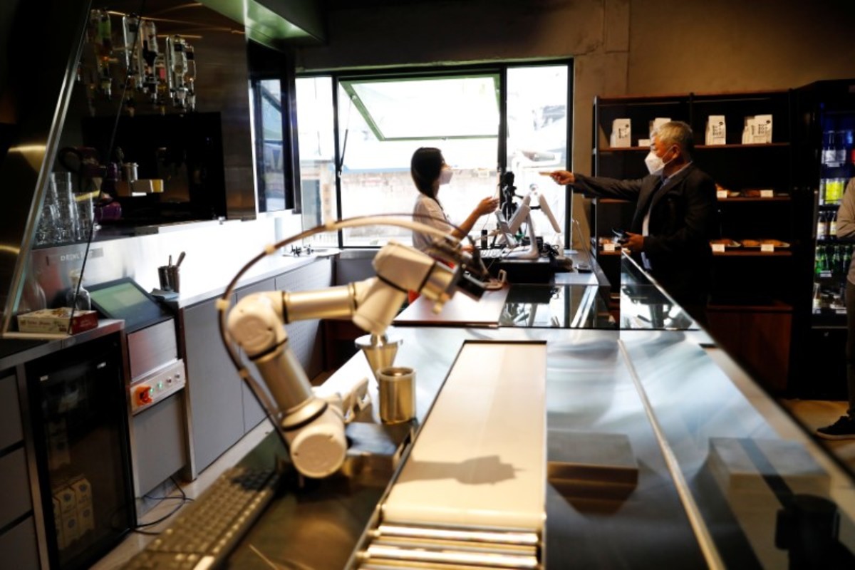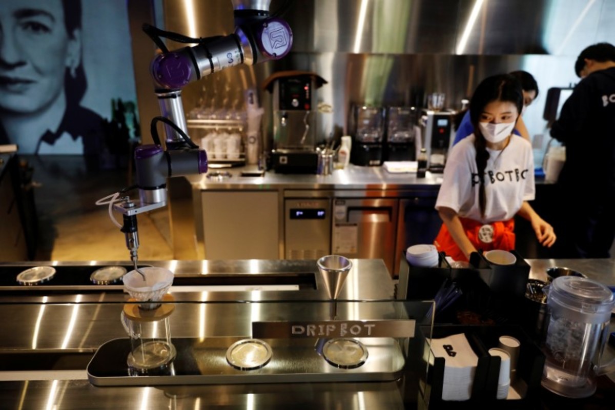 An ice carving robot carves an ice cube as a measure to minimise human contact to avoid the spread of the coronavirus disease (COVID-19) during its demonstration at a bar in Seoul, South Korea, June 3, 2020. REUTERS/Kim Hong-JiDessert Bot is seen as an employee wearing a mask to avoid the spread of the coronavirus disease (COVID-19) takes an order at a cafe in Seoul, South Korea, June 3, 2020. REUTERS/Kim Hong-JiAn employee wearing a mask to avoid the spread of the coronavirus disease (COVID-19) works at a cafe in Seoul, South Korea, June 3, 2020. REUTERS/Kim Hong-JiDrip Bot makes a cup of coffee as an employee wearing a mask to avoid the spread of the coronavirus disease (COVID-19) works at a cafe in Seoul, South Korea, June 3, 2020. REUTERS/Kim Hong-JiDrink Bot makes a cocktail as a measure to minimise human contact to avoid the spread of the coronavirus disease (COVID-19) at a cafe in Seoul, South Korea, June 3, 2020. REUTERS/Kim Hong-Ji