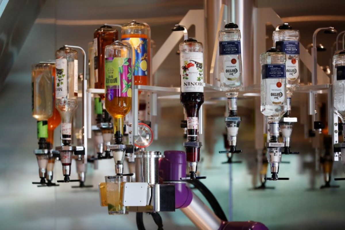 One robot makes cocktails from 25 bottles hanging upside-down from the ceiling, another carves perfect ice balls in the fraction of the time it takes a human with a knife and an ice pick.