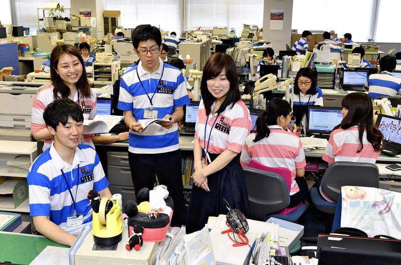 Higashiosaka municipal government employees work in rugby shirts at their office on Tuesday, the first day of the "Cool Biz" campaign at ministries, agencies and companies. The campaign encourages people to put on lighter clothes to save energy. Located in Osaka Prefecture, Higashiosaka is one of the host cities of the 2019 Rugby World Cup. The municipal government's practice of wearing rugby shirts during the campaign started in 2010 when the city launched its bid to become a host city.