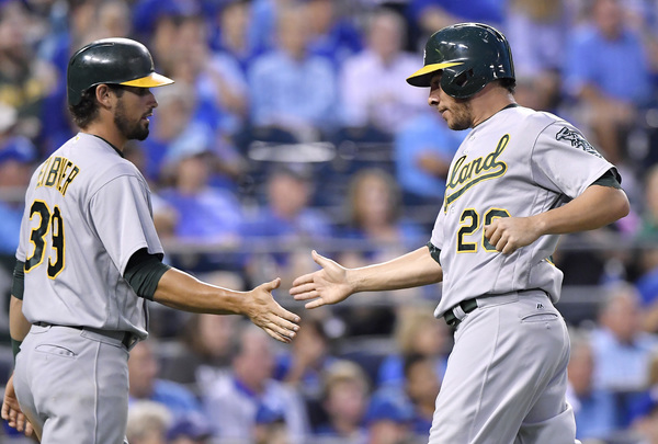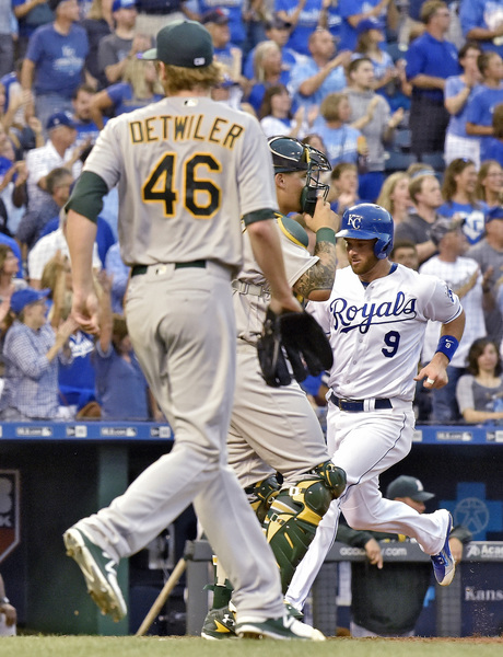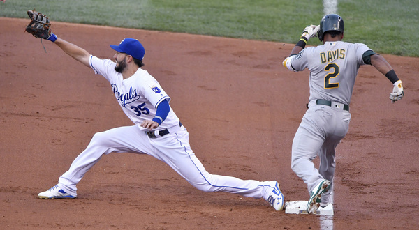 Royals starter Dillon Gee was roughed up for five runs in 3 1/3 innings, allowing a mammoth three-run homer into the Water Spectacular from Oakland's Kris Davis in the top of the third.