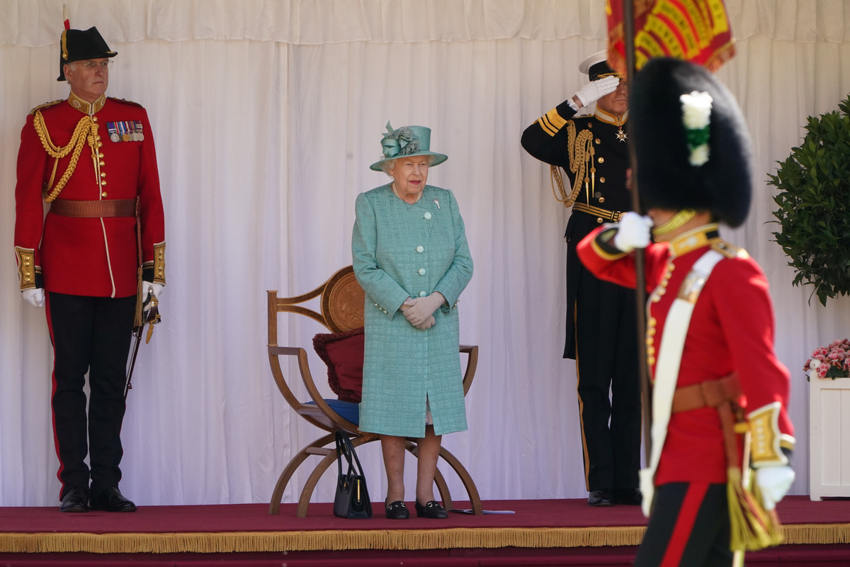 But she had not been seen in public until Saturday, when dressed in a jade coat and wearing a diamond Welsh Guards brooch, she observed soldiers adhering to the 2-metre social distancing rule, and listened to music performed by a Band of the Household Division.