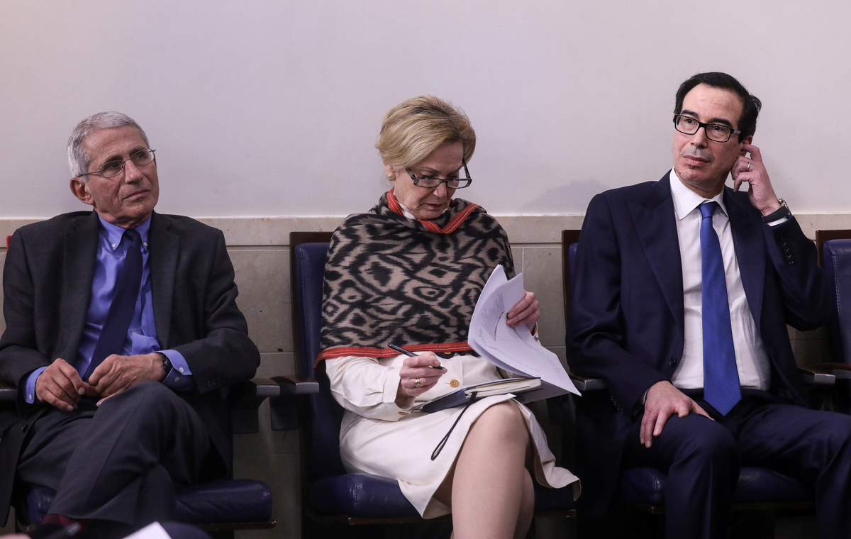 National Institute of Allergy and Infectious Diseases Director Dr. Anthony Fauci listens with Dr. Deborah Birx and Treasury Secretary Steven Mnuchin as U.S. President Donald Trump leads the coronavirus task force daily briefing at the White House in Washington, U.S., April 13, 2020. REUTERS/Leah Millis