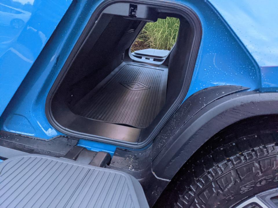 Like many new EVs, there is a front trunk where an engine would typically reside. Unfortunately, unlike the F-150 Lightning and the GMC Hummer, the front panel that would typically be a grille, is fixed in place rather than being attached to the hood. That means there is quite a tall liftover to access the 11 cubic feet of storage. Like Ford’s EVs, Rivian has incorporated a drain in the bottom so that you can throw wet gear in there or even use it to hold ice and cold beverages for a tailgate party.