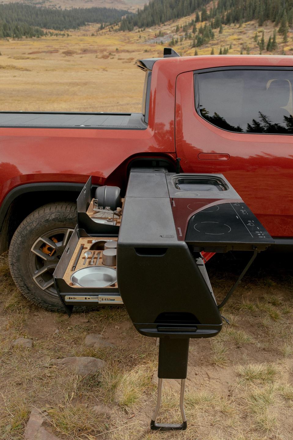Perhaps the most distinctive feature of the R1T is the gear tunnel made possible by the dedicated EV design. Between the cab and rear wheel arches is a storage compartment that spans the full width of the truck with access panels on both sides. The tunnel can hold 11.6 cubic feet of stuff including the optional camp kitchen. This $5,000 unit slides out of the tunnel and features a 2 burner induction cooktop, 4-gallon water tank and collapsible sink for preparing meals in the wilderness and then cleaning up. With the optional power tonneau cover closed, the bed will hold 29.2 cubic feet of stuff including lots of mulch. There’s also another 14 cubic feet in a compartment below the bed floor where the available full-size spare, a rarity in EVs, is stored.