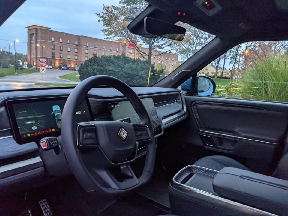 Driving through town, the Rivian is far easier to maneuver than a full-size truck and once on some curving back roads, it felt surprisingly nimble despite its 7,000-lb curb weight. While that’s a full ton less than the larger Hummer EV, it’s still 500-lbs more than what the Ford F-150 Lightning is projected to weigh.