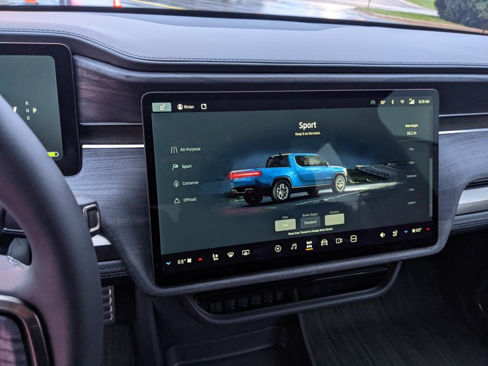 The multiple drive modes and ride height adjustment for the air-spring suspension are all handled via the screen. The R1T is claimed to be able to ford through 3 feet of water and the air springs can lift the truck to provide up to 14-inches of ground clearance, more than either the F-150 or Ram TRX. Unfortunately, during the drive, while switching modes, it became stuck in sport mode at one point, so there are some software bugs that still need to be fixed.