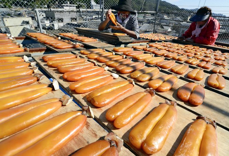 The mullet roe is turned over many times a day and sun-dried for about two weeks until golden brown at the Hashisa Shoten store in the city.