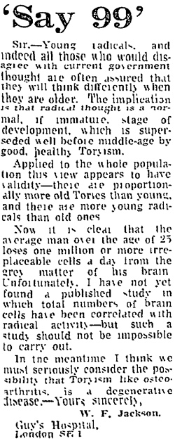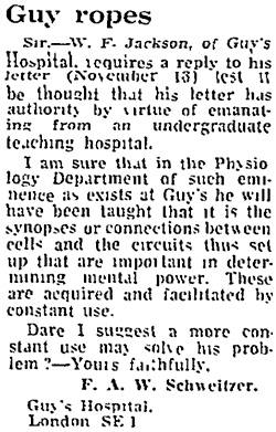 More significantly, the Guardian published a letter of disagreement from a surgeon at Guy’s, dissociating the institution from my views, though the Guardian – true to form at the time – managed to obscure his argument by misprinting “synapses” as “synopses”! To be fair, others at Guy’s congratulated me on the letter and no action was taken against me for writing from that address – nor did it harm my future career.