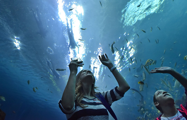 Vanessa Chaney, watching from the underwater acrylic tunnel as her husband floated above, was tentative about seeing those big fish circling the divers.