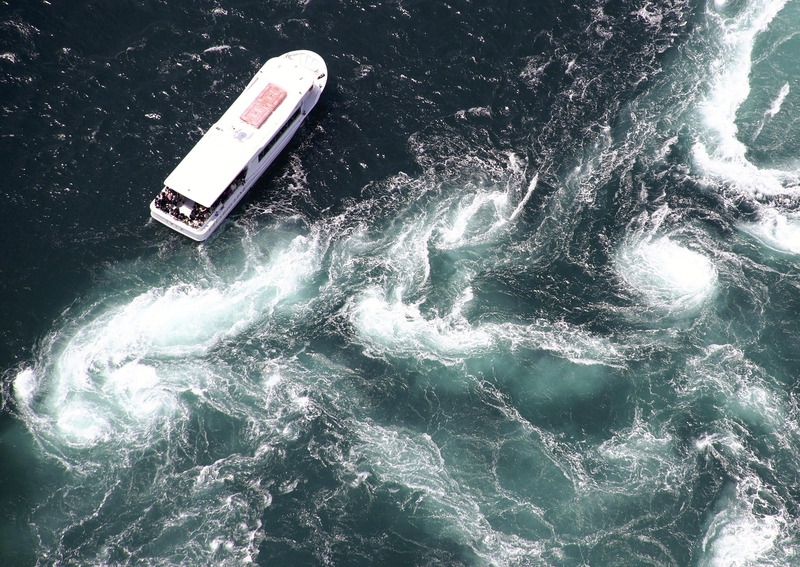 A flood tide creates large whirlpools on Thursday in the Naruto Strait in Tokushima Prefecture, while a pleasure boat sails among the swirls. The flood tide coincided with the Golden Week holiday, attracting many visitors to this sightseeing spot in the Shikoku region. According to the Naruto City Uzushio Tourist Association, flood tides have appeared frequently during this holiday break, and another tide is forecast for around May 18.