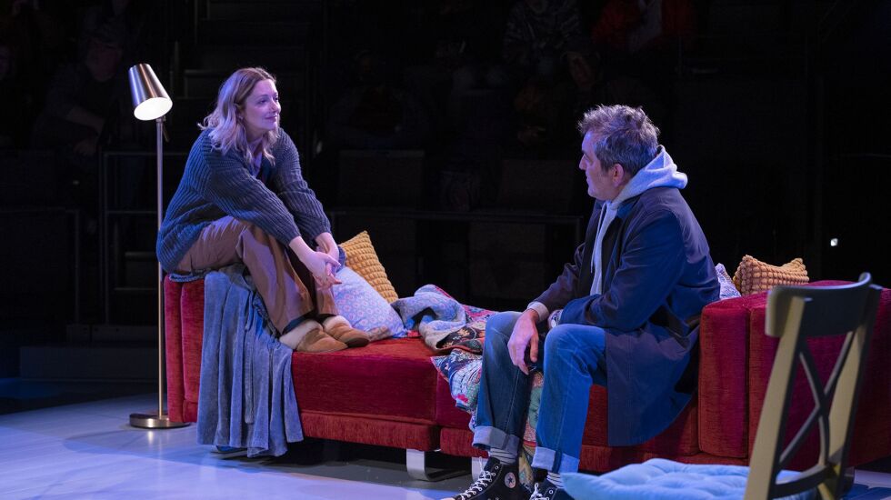 Sitting in their apartment, Sunny and the now-successful author Nick are often being watched by their invasively observant teenage daughter Jo (Nicole Scimeca), who stalks the stage with a flickering iPad, her restless fingers forever tapping and scrolling as she observes (and sometimes comments on) her parents’ volatile relationship.