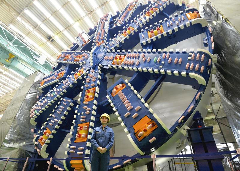 Central Japan Railway Co. (JR Tokai) unveiled a digging shield machine with a diameter of 14 meters to be used in the construction of a tunnel for the linear Chuo Shinkansen line for the first time in Kobe on Wednesday.