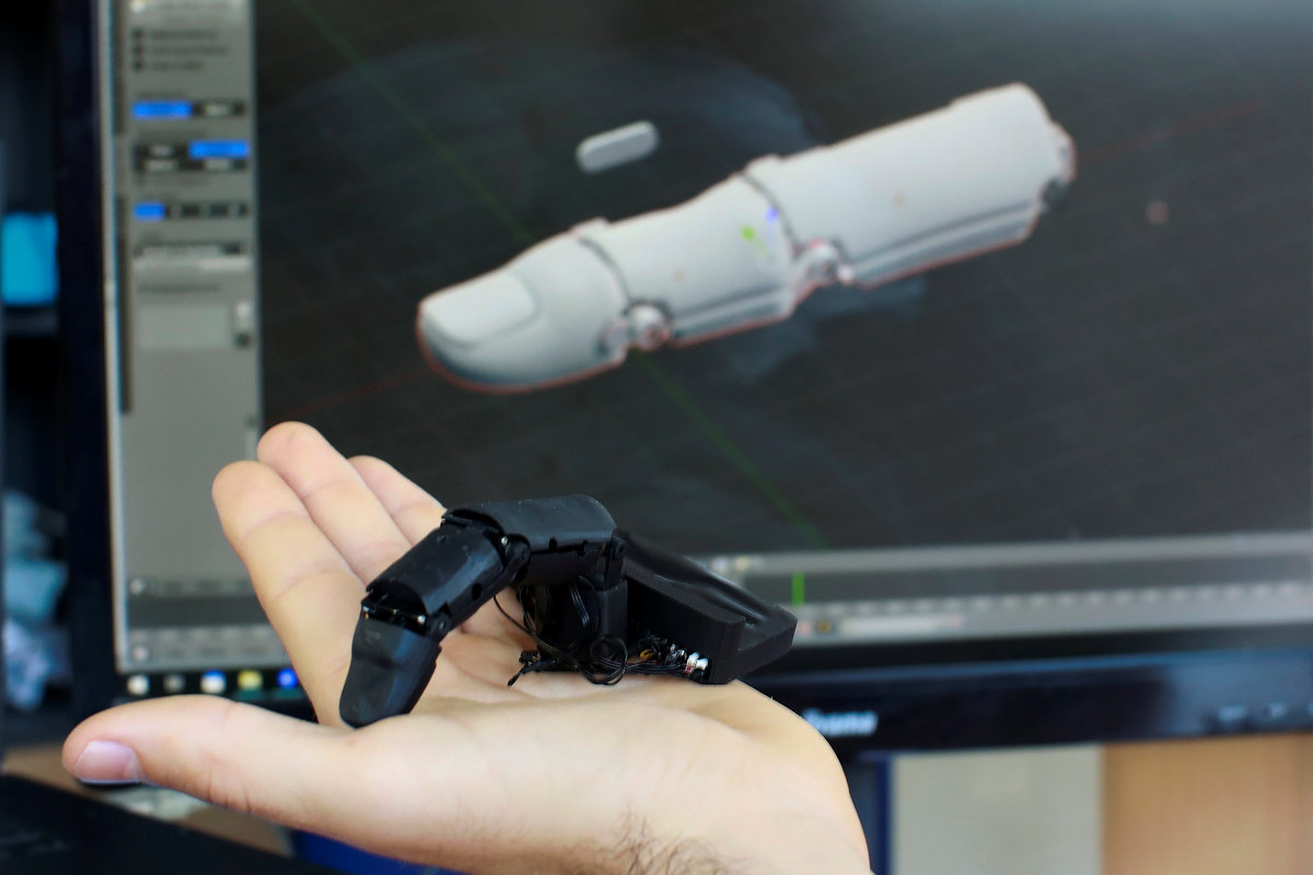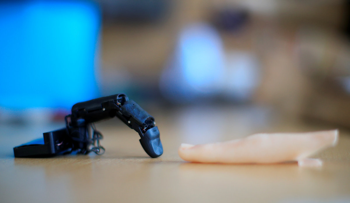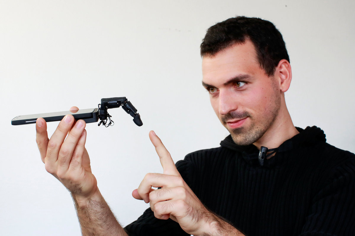 So he designed, built and patented the MobiLimb robotic finger, which plugs into a mobile phone and looks very much like a real finger. It can drag the phone across the table. Your friends can activate it and operate it remotely, to give you a comforting pat on the wrist when they talk to you.