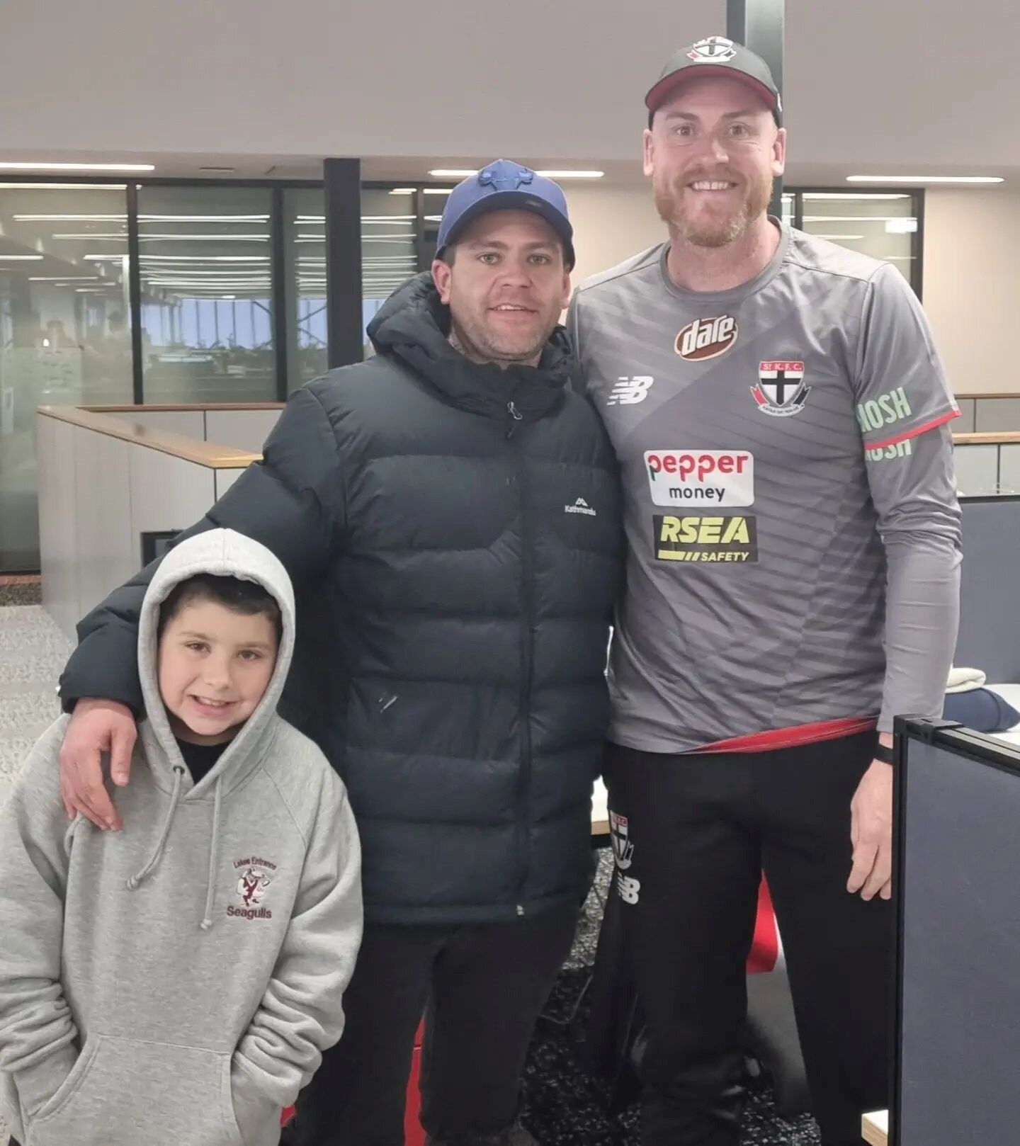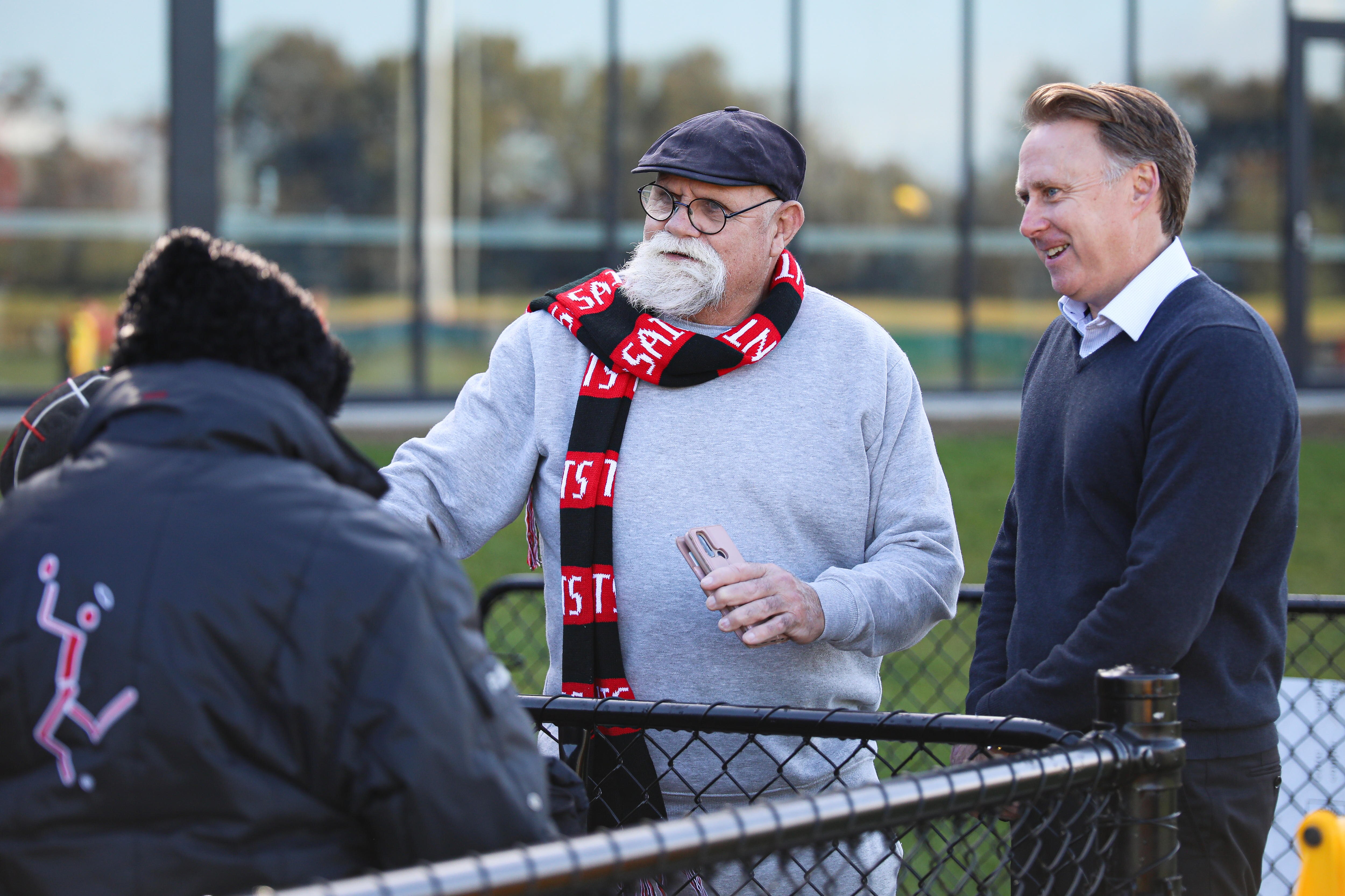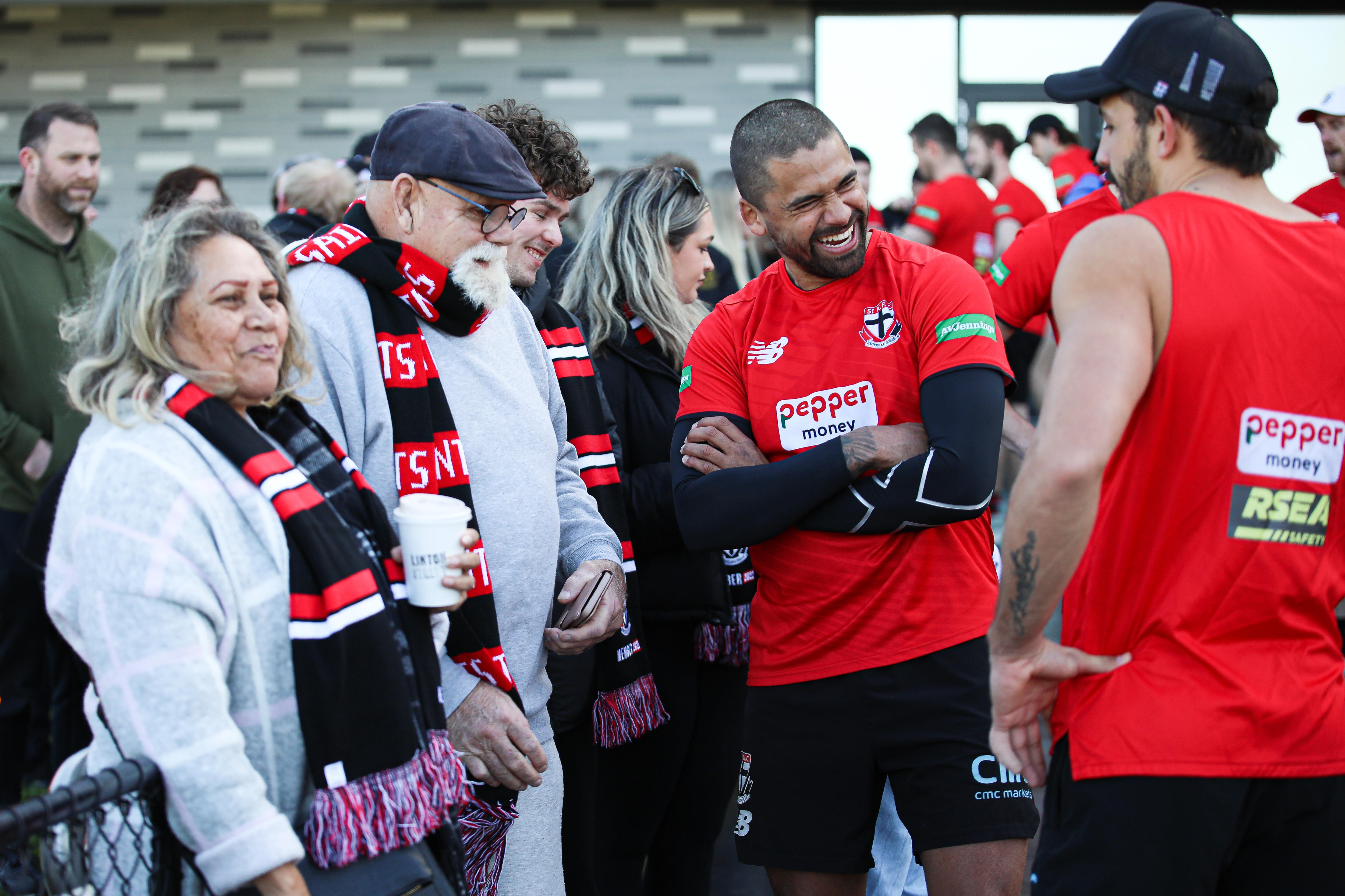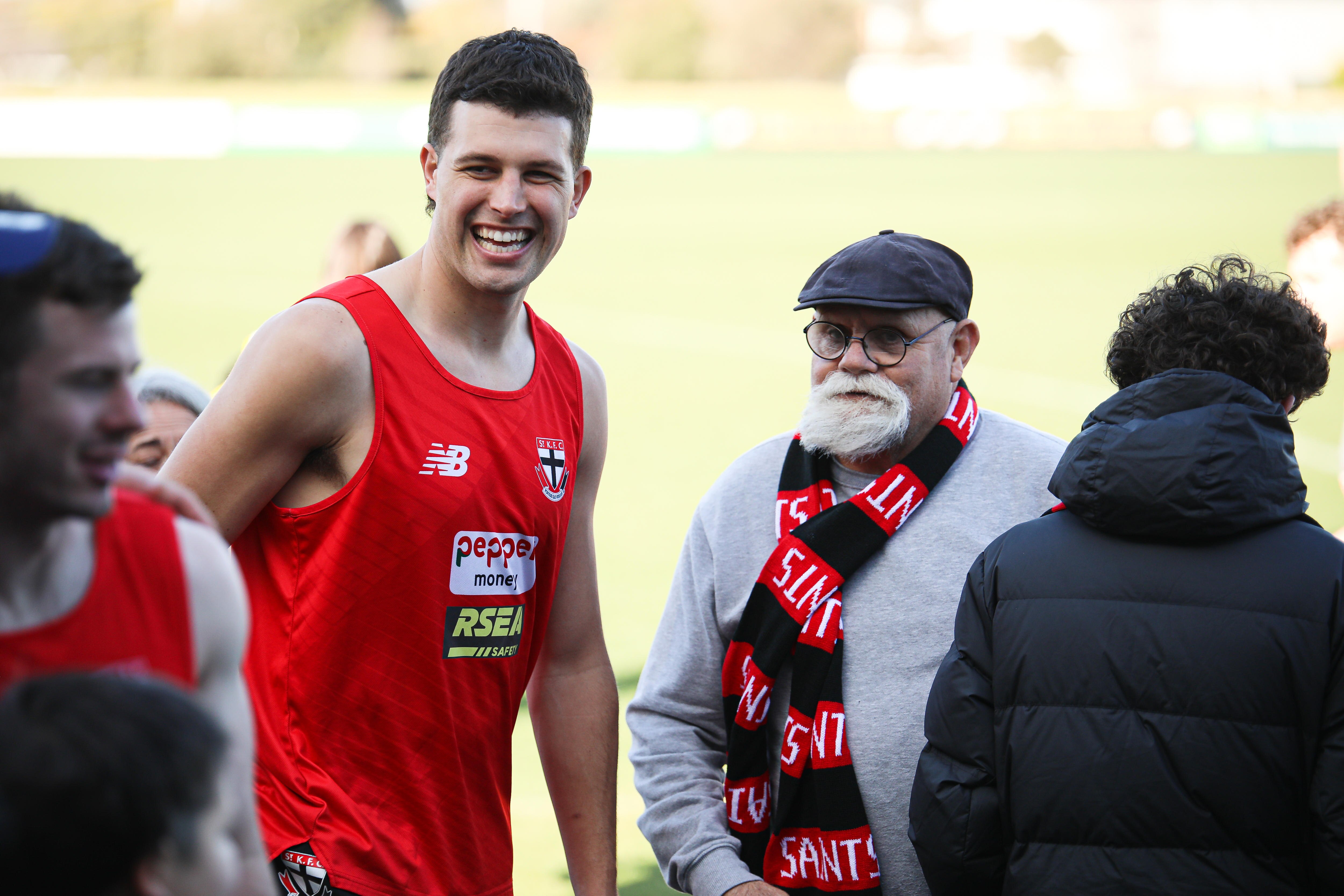 There was one hitch: in Muir's wilderness years, much of the extended family's allegiance had shifted to Hawthorn. A dozen Saints scarves quickly materialised and there was talk of a mass conversion, but a lifetime habit looked hard to break when they swamped Saints assistant coach Jarryd Roughead for photos.