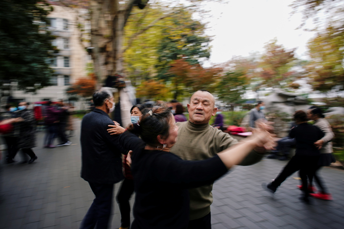 At the gates of residential compounds, staff in blue tents monitor residents' smartphone health codes. In a public park, slogans on red propaganda banners urge people to remain vigilant.