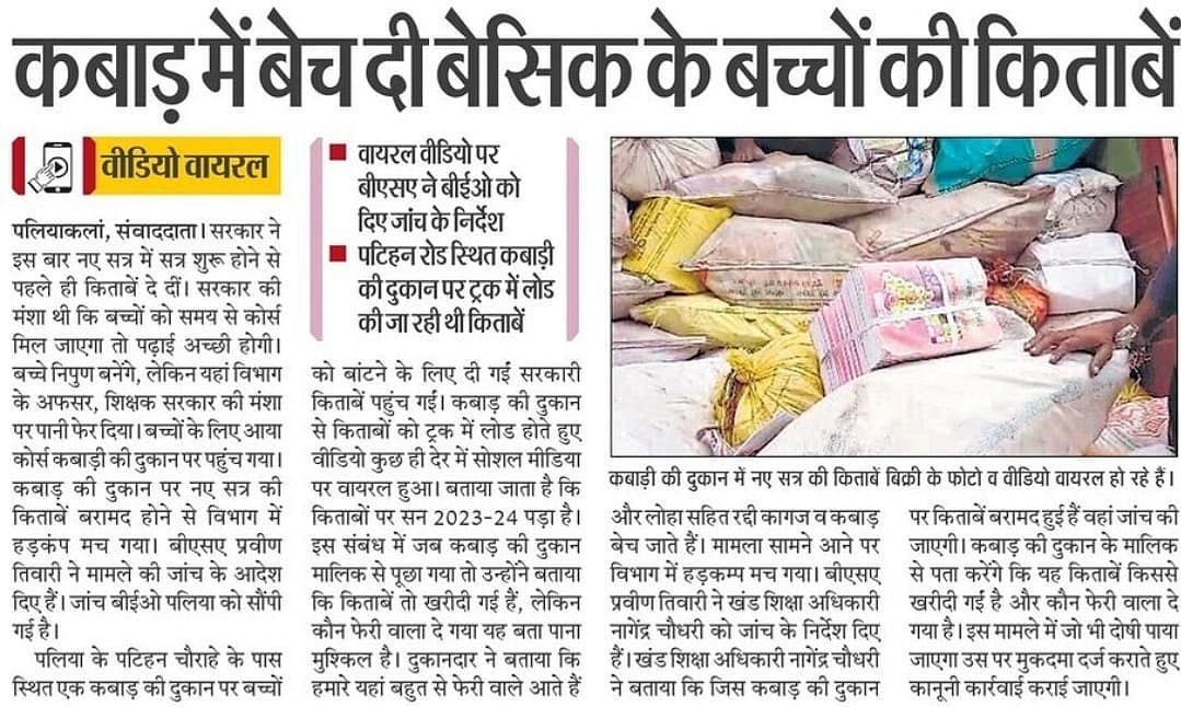 22 अगस्त को उत्तर प्रदेश के लखीमपुर खीरी जिले का एक वीडियो सोशल मीडिया पर वायरल हो रहा है. वीडियो में नए सत्र की किताबें एक ट्रक में कबाड़ के साथ रखी हैं. वीडियो वायरल होने के बाद जिला बेसिक शिक्षा अधिकारी (बीएसए) प्रवीण तिवारी ने खंड शिक्षा अधिकारी (बीईओ) नागेंद्र चौधरी को मामले की जांच के आदेश दिए.