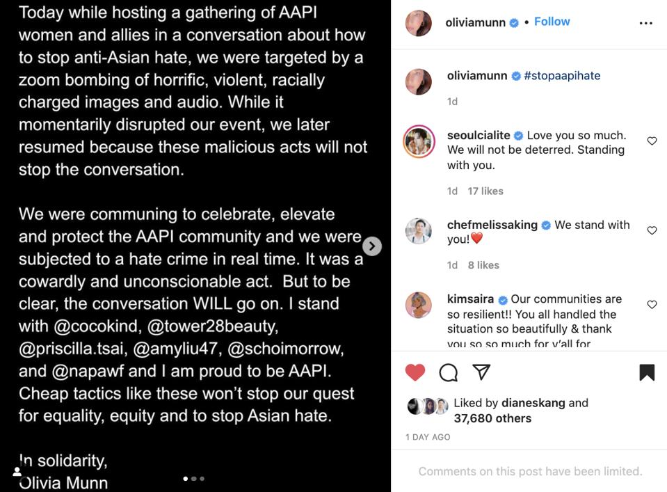 “Today while hosting a gathering of AAPI women and allies in a conversation about how to stop anti-Asian hate, we were targeted by a zoom bombing of horrific, violent, racially charged images and audio,' Munn writes on Instagram. “We were communing to celebrate, elevate and protect the AAPI community and we were subjected to a hate crime in real time. It was a cowardly and unconscionable act.”