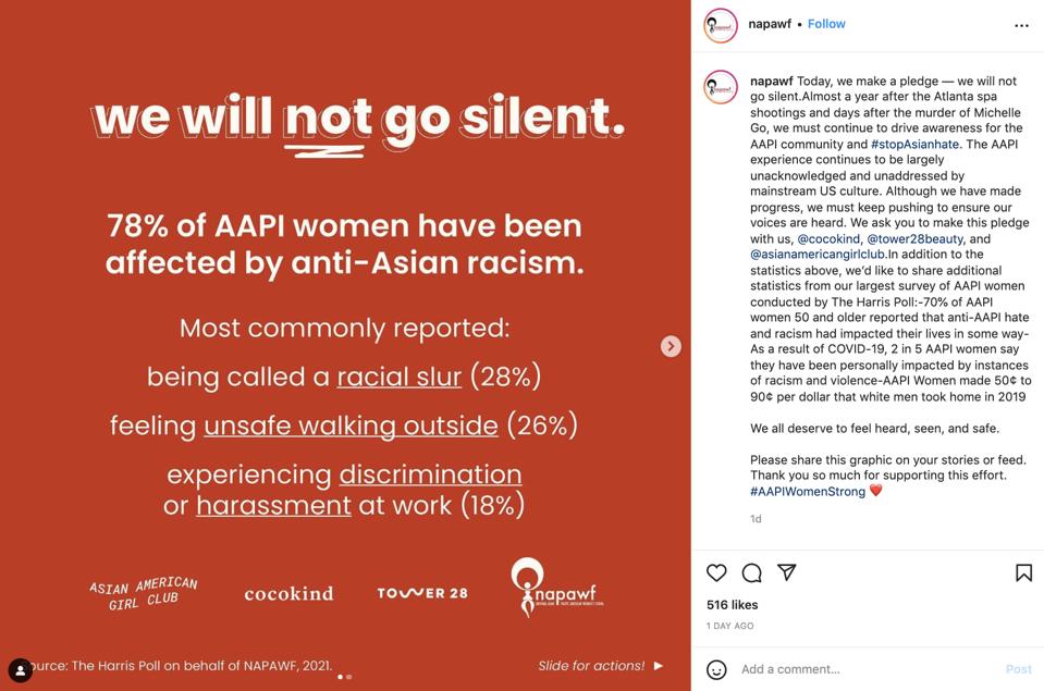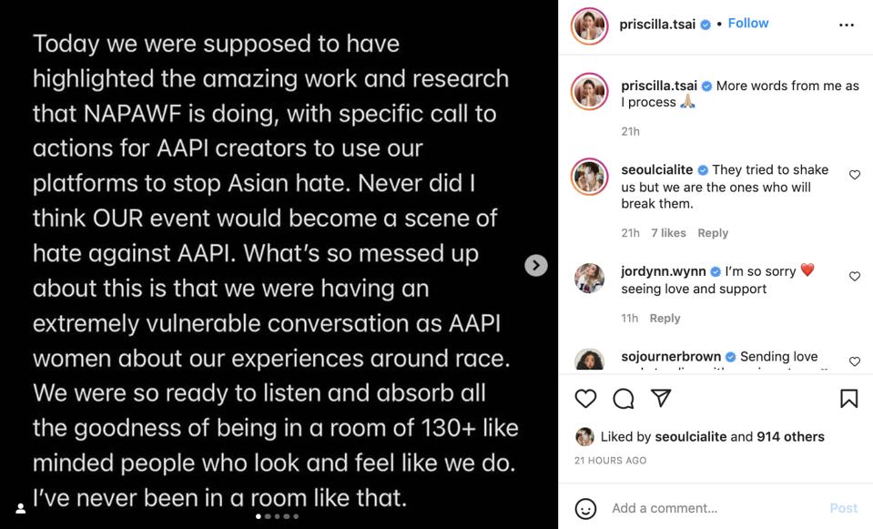 Cocokind founder Priscilla Tsai voiced the unity of the AAPI community in her own Instagram post, “I don’t think I’ll EVER be able to erase those words and visuals from my head, but I also won’t ever forget the way our community is supporting each other right now.”