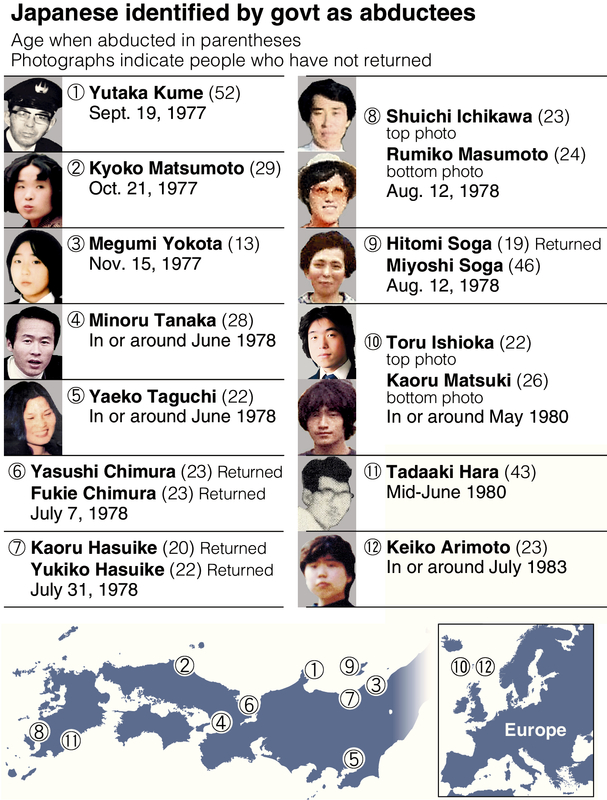 The government has recognized 12 cases of Japanese citizens being abducted by North Korea. Those cases involve 17 victims. North Korea admitted to the abductions of Japanese citizens at a summit with Japan in September 2002. Five abductees, including Kaoru Hasuike, 60, and his wife, returned to Japan in October the same year.