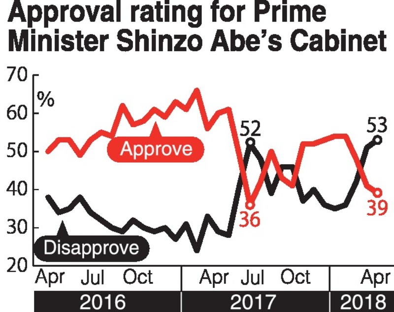 The approval rating for Prime Minister Shinzo Abe's Cabinet continues to fall, dropping to 39 percent in a recent nationwide opinion poll conducted by The Yomiuri Shimbun from Friday to Sunday.