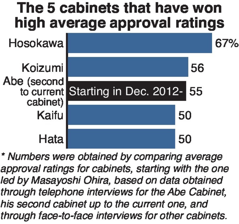 The Abe Cabinet's support rate ranks third, only exceeded by 67 percent for the Cabinet of Morihiro Hosokawa (1993-94) and 56 percent for the Cabinet of Junichiro Koizumi (2001-06), among all cabinets inaugurated after March 1978, when The Yomiuri's surveys started.