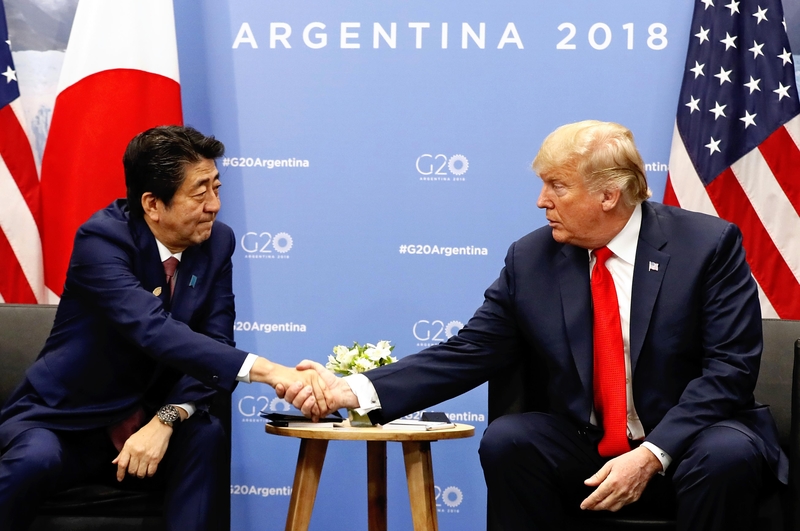 Prime Minister Shinzo Abe, left, shakes hands with U.S. President Donald Trump in Buenos Aires on Friday.
