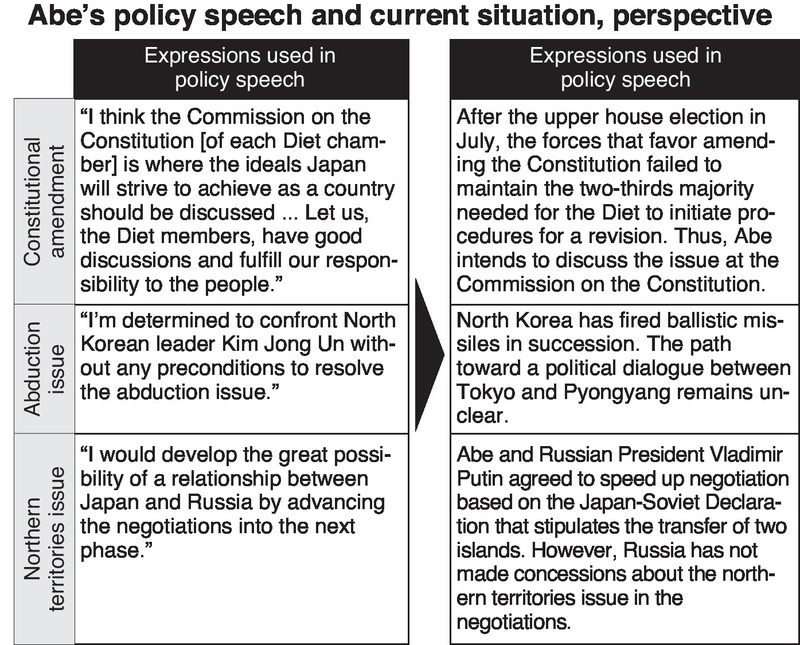During a policy speech that Abe delivered Friday, he referred to government attempts to address these issues -- for which require cooperation of the opposition parties, North Korea and Russia is indispensable -- refraining from making a bold statement to shape his political legacy.