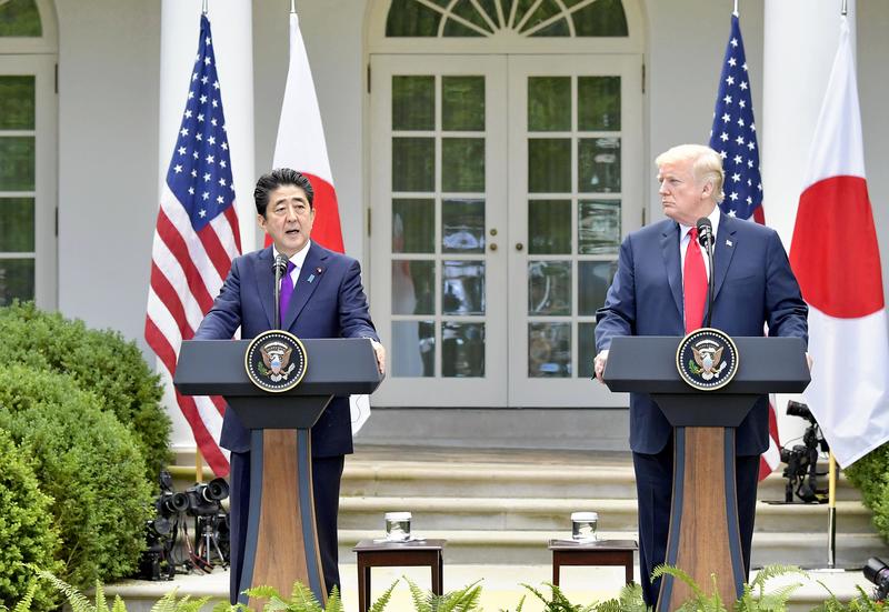 WASHINGTON -- Prime Minister Shinzo Abe reiterated his determination to resolve the issue of North Korea's abduction of Japanese nationals through a face-to-face dialogue with the country's leader Kim Jong Un at a joint press conference after a summit with U.S. President Donald Trump on Thursday.