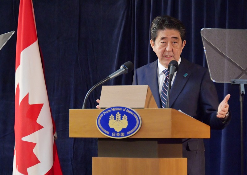 Regarding U.S. President Donald Trump's proposal to readmit Russia to the G-7, Abe said, "It's also necessary to call for Russia's constructive involvement to present proper solutions to address global challenges."