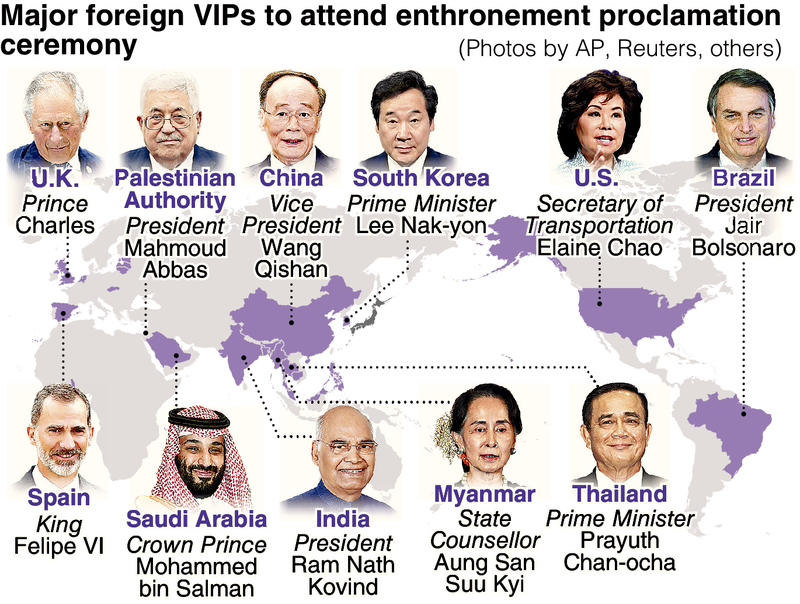 According to government sources, more than 70 countries are expected to send to the ceremony their heads of state, such as kings and presidents, while royal family members, heads of government, ministers and ambassadors to Japan are among the guests to attend the ceremony. The United States has dispatched Transportation Secretary Elaine Chao, even though Japan had hoped that Vice President Mike Pence could make it.