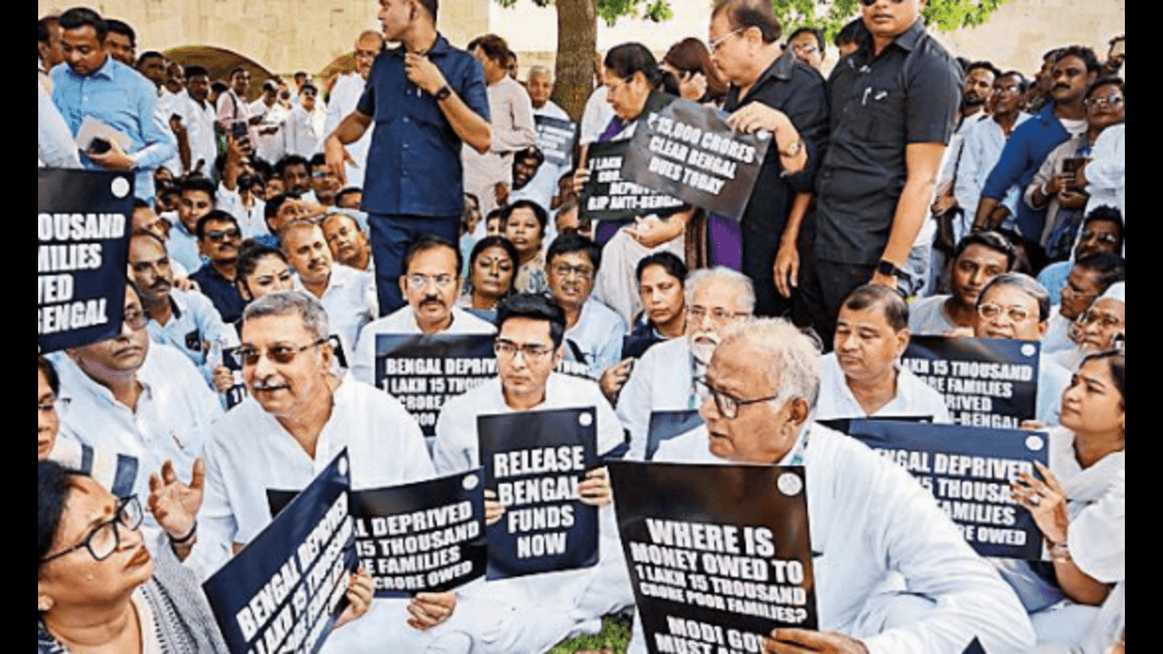 Banerjee, accompanied by other TMC MPs and a state minister, had been on a silent sit-in at Rajghat, demanding the release of funds to Bengal, including those for MGNREGS. The protesters sported black badges and held placards with their dem-ands.